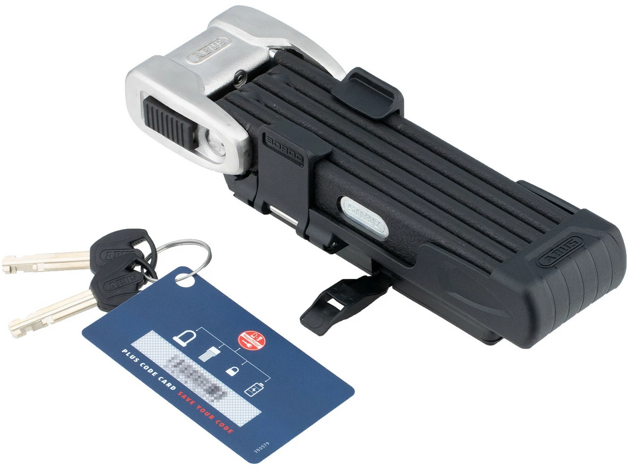 Lieferumfang:1 x Faltschloss ABUS Bordo Centium2 x Schlüssel ABUS1 x Halter ABUS SH 6000/901 x ABUS Plus Code Card