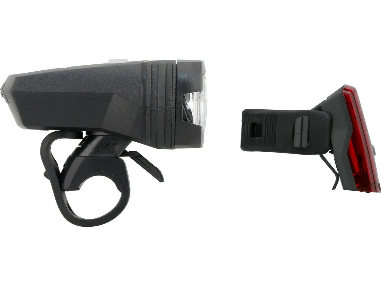 Spezifikationen Frontlicht:Ausführung:Frontlicht (weiß)Montage:LenkerLeuchtmittel:LED (1)Leuchtkraft:50 LuxLeuchtdauer:13 StundenLeuchtweite:70 mBetriebsmittel:Akku (Li-Ion), integriertTechnische Daten Frontlicht:Leuchtmodi:2 Modi (Dauerlicht, optimierte Lichtleistung)Ladestandsanzeige:Ja (Batterie schwach)Ladezeit:2 StundenMaße (H x B x L):80 x 45 x 60 mmMaterial:KunststoffSchalter:Ein / AusFreigaben Frontlicht:Zulassung im Straßenverkehr:Ja, für Fahrräder nach §67 StVZOPrüfziffer:K~~1099Spezifikationen Rücklicht:Ausführung:Rücklicht (rot)Montage:Sattelstütze, HinterbaustrebenLeuchtmittel:LED (1)Leuchtdauer:4 StundenLeuchtmodi:1 ModusBetriebsmittel:Akku (Li-Ion), integriertTechnische Daten Rücklicht:Leuchtmodi:1 ModusLadestandsanzeige:Ja (Batterie schwach)Ladezeit:1,5 hMaße (H x B x T):45 x 30 x 30 mmMaterial:KunststoffSchalter:Ein / AusFreigaben Rücklicht:Zulassung im Straßenverkehr:Ja, für Fahrräder nach §67 StVZOPrüfziffer:K~~1100Kompatibilität:Frontlicht: