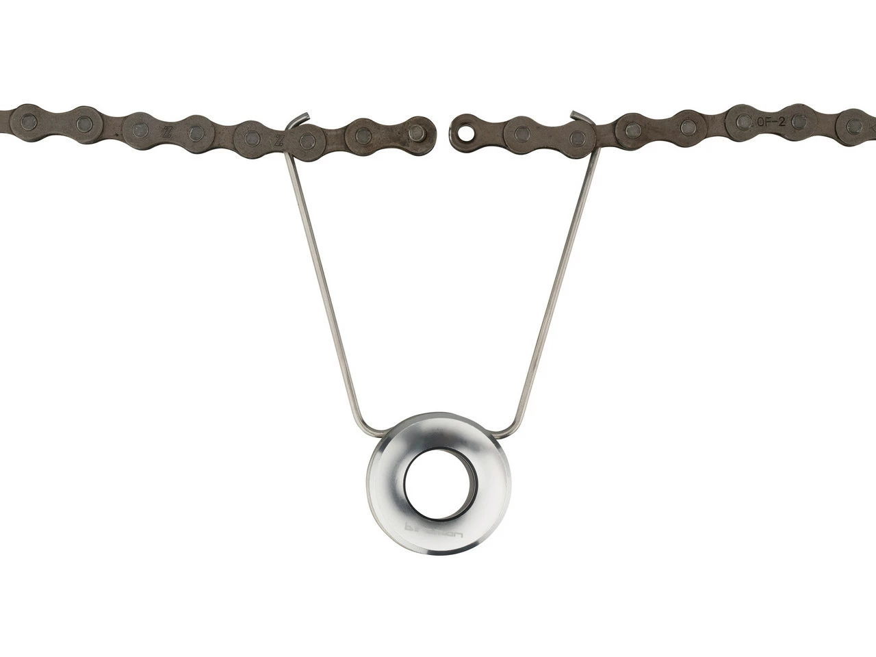 Der Birzman Kettenhalter erleichtert die Kettenmontage. Einfach in die offene Kette einhängen und die Kette kann ohne Spannung montiert werden.