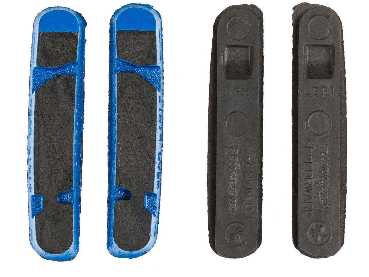 Features:für Campagnologeräuschärmer als der VorgängerbelagWarnhinweis des Herstellers:Es wird dringend vom Gebrauch der roten Bremsschuhe (für Carbon-Laufräder) auf Felgen mit P.E.O.-Beschichtung abgeraten, da bei diesen Laufrädern die Bremskraft auf „trockenem“ Untergrund stark von der auf „nassem“ Untergrund abweicht. Insbesondere könnten Gefahrensituationen eintreten aufgrund der Tatsache, dass der Radfahrer auf „nassem“ Untergrund die Bremshebel stärker betätigt, aber bei augenblicklichem Trocknen der Felge und damit beträchtlicher Variation der Bremswirkung der roten Bremsschuhe könnte diese Betätigung zu einem unvermittelten Blockieren der Räder führen. Aus diesem Grund sind die einzigen Bremsschuhe, die mit den Campagnolo Shamal Mille und den Fulcrum Racing Zero Nite verwendet werden dürfen, die spezifischen blauen Bremsschuhe, bei denen die Bremswirkung unter „trockenen“ und „nassen“ Bedingungen sich nicht übermäßig ändert.