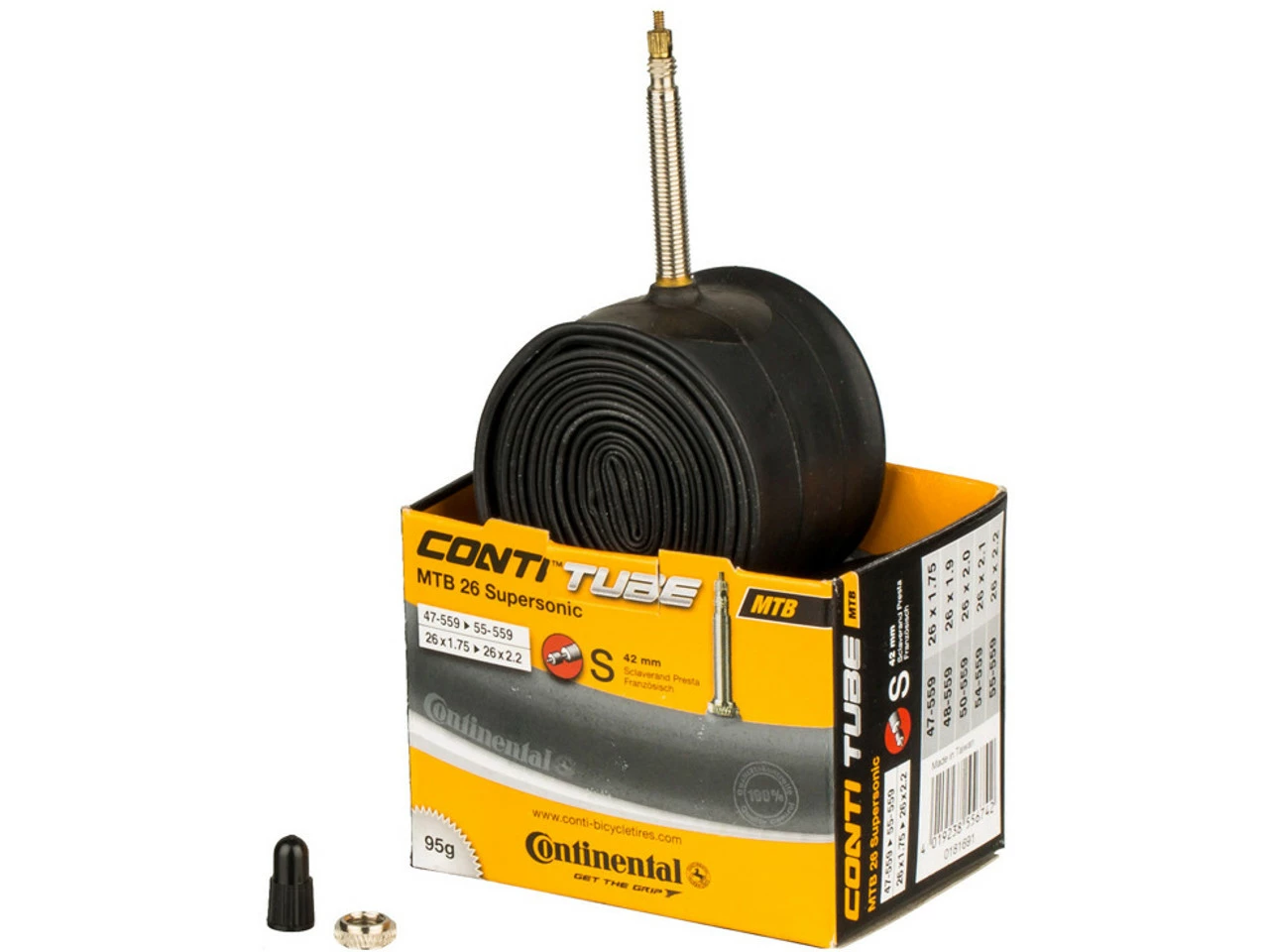 Bezeichnungen/Synonyme: Sclaverand-Ventil (SV), Französisches Ventil, Presta-VentilAußendurchmesser: 6,5 mmSonstiges: Bei allen Continental-Schläuchen mit SV-Ventil ist das Ventil abschraubbar (Ventilverlängerung, Befüllen mit Antiplatt-Mitteln etc.).Lieferumfang:1 x Schlauch Continental MTB Supersonic