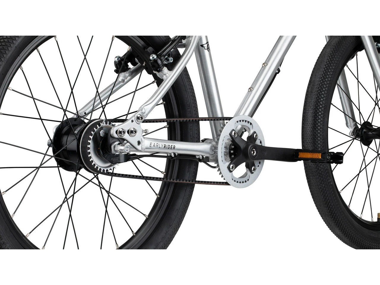 Das EARLY RIDER Belter Kinderfahrrad in 20 Zoll ist ein superleichtes Bike mit Riemenabtrieb und Gangschaltung. Dank der Vier-Gang-Nabenschaltung werden selbst kleine Hügel mit Leichtigkeit bewältigt. Außerdem entfällt durch den Antriebsriemen das Reinigen und Schmieren der Kette, der Riemen läuft nämlich immer geschmeidig. Weiterer Pluspunkt: Die Hosenbeine bleiben sauber! Der Rahmen aus Aluminium und die hochwertigen Ritchey Parts verzeihen die ein oder andere Unachtsamkeit des Nachwuchsbikers. Gute Dämpfung und stabiles Fahrverhalten, selbst wenn es mal etwas holpriger wird, werden von den 2″ breiten Reifen erzielt. Leicht zu bedienende Felgenbremsen bringen auch bergab ausreichend Sicherheit.