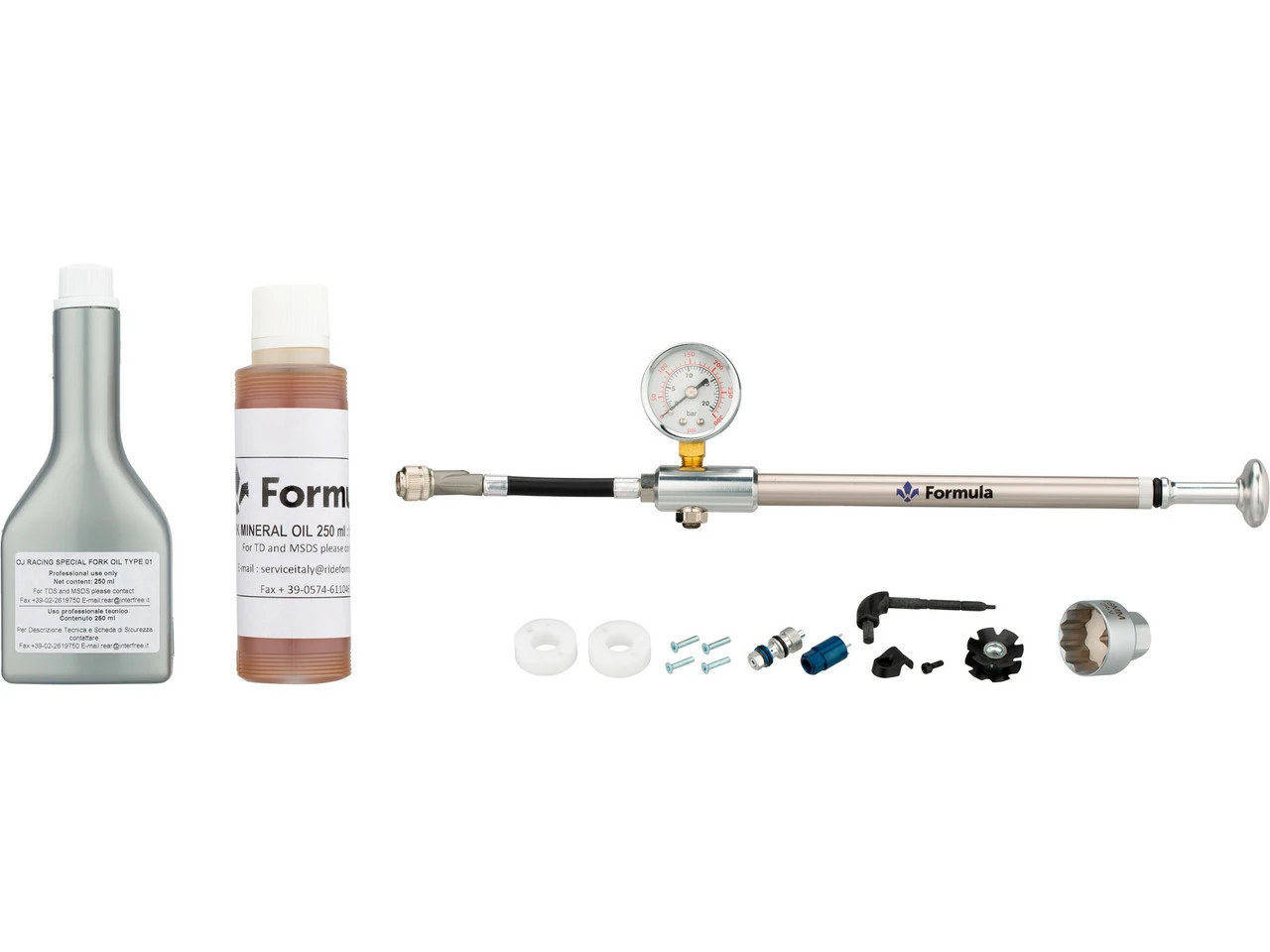 Federweg: 170 – 180 mmGabelschaft: 1 1/8″ – 1,5″ taperedVorlauf: 46 mmBremsaufnahme: Disc PM6 (direct mount 160 mm)Achssystem: Steckachse (20 x 110 mm)Herstellernummern: SB60SRB704 (matte black), SB60SRU704 (ultraviolet)Lieferumfang:1 x Federgabel Formula Selva R 27,5″1 x Steckachse Formula ILS (Integrated Locking System)1 x Montagewerkzeug Formula Topcap Tool1 x Compression Kit Formula CTS Blau1 x Montagewerkzeug Formula CTS Tool1 x Gabelkralle1 x Federgabelpumpe Formula1 x OJ Racing Special Fork Oil Type 01 (250 ml)1 x Mineralöl (250 ml)inkl. Federwegsspacer
