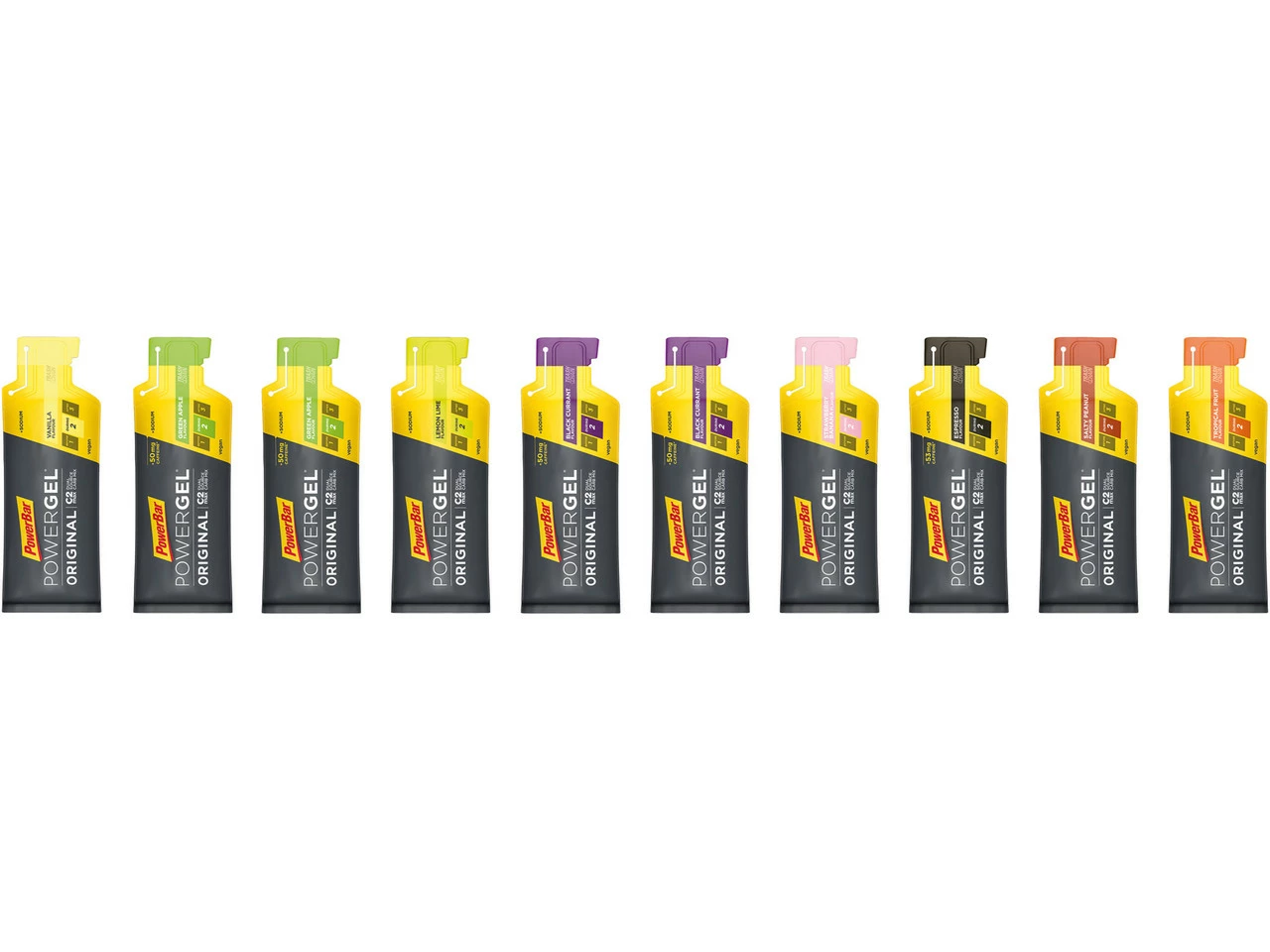Vanilla:Konzentriertes Kohlenhydratgel für Sportler mit Natrium. (CH: Ergänzungsnahrung.) Vanille GeschmackStrawberry Banana:Konzentriertes Kohlenhydratgel für Sportler mit Natrium. (CH: Ergänzungsnahrung.) Erdbeer Banane GeschmackLemon Lime:Konzentriertes Kohlenhydratgel für Sportler mit Natrium. (CH: Ergänzungsnahrung.) Zitronen GeschmackSalty Peanut:Konzentriertes Kohlenhydratgel für Sportler mit Natrium. (CH: Ergänzungsnahrung.) Erdnuss GeschmackTropical Fruit:Konzentriertes Kohlenhydratgel für Sportler mit Natrium. (CH: Ergänzungsnahrung.) Tropische Früchte GeschmackBlack Currant – Caffeine:Konzentriertes Kohlenhydratgel für Sportler mit Koffein und Natrium. (CH: Ergänzungsnahrung.) Schwarze Johannisbeere GeschmackGreen Apple – Caffeine:Konzentriertes Kohlenhydratgel für Sportler mit Koffein und Natrium. (CH: Ergänzungsnahrung.) Grüner Apfel GeschmackEspresso – Caffeine:Konzentriertes Kohlenhydratgel für Sportler mit Koffein und Natrium. (CH: Ergänzungsnahrung.) Kaffee Geschmack