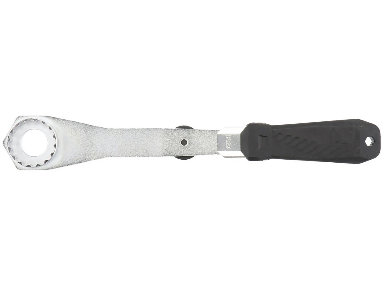 Das PRO Innenlager- / Kettenblattwerkzeug dient zur Montage und Demontage von Shimano Hollowtech II Lagerschalen der Innenlager BB-MT800 und SM-BBR60. Mit dem Werkzeug ist es außerdem möglich den Kettenblattverschlussring der Shimano XTR M9100 Direct-Mount Kettenblätter zu lösen. Dank des mitgelieferten Staubkappenschlüssels kann die Kurbelschraube der Kurbel gelöst werden. Das PRO Tool besteht aus gehärtetem Stahl, was für Stabilität und Haltbarkeit sorgt, und der extra lange und gummierte Griff ermöglicht ein ergonomisches Arbeiten mit optimaler Hebelwirkung.