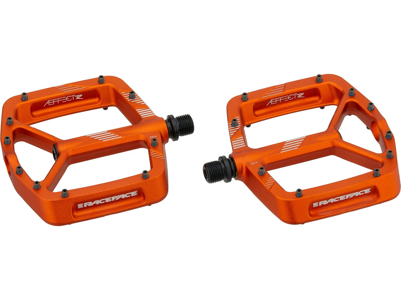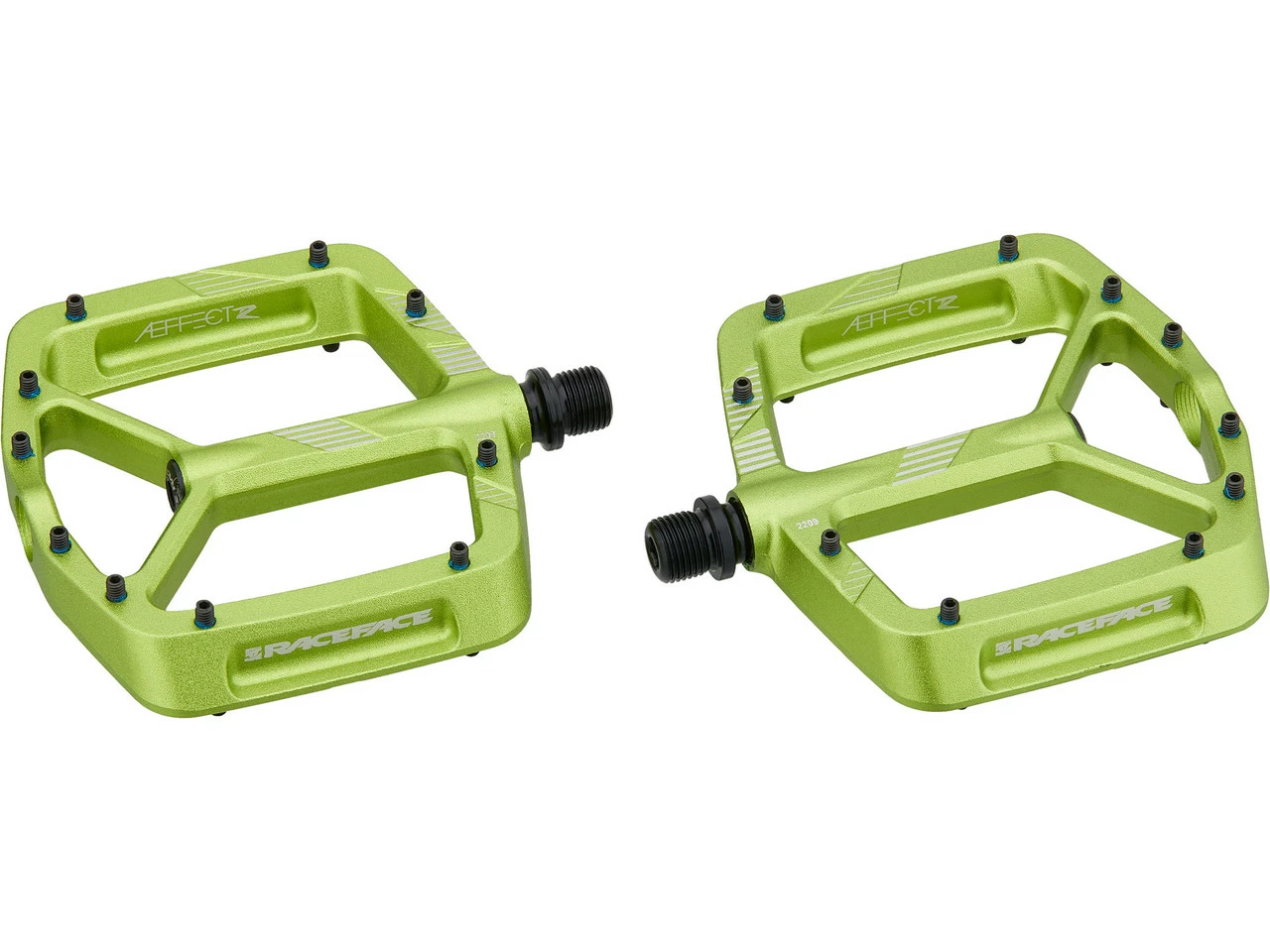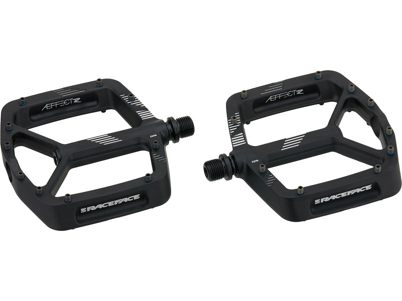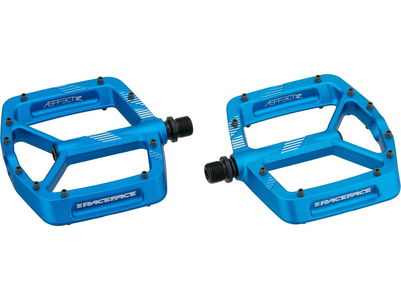Die Aeffect R Aluminium-Plattformpedale von Race Face geben Dir auf Singletrails mit ihrer großen Plattform sicheren Halt und sind dabei leicht und widerstandsfähig. Die Pins, zehn pro Pedalseite, sind austauschbar.