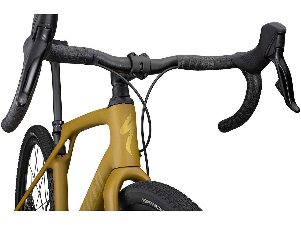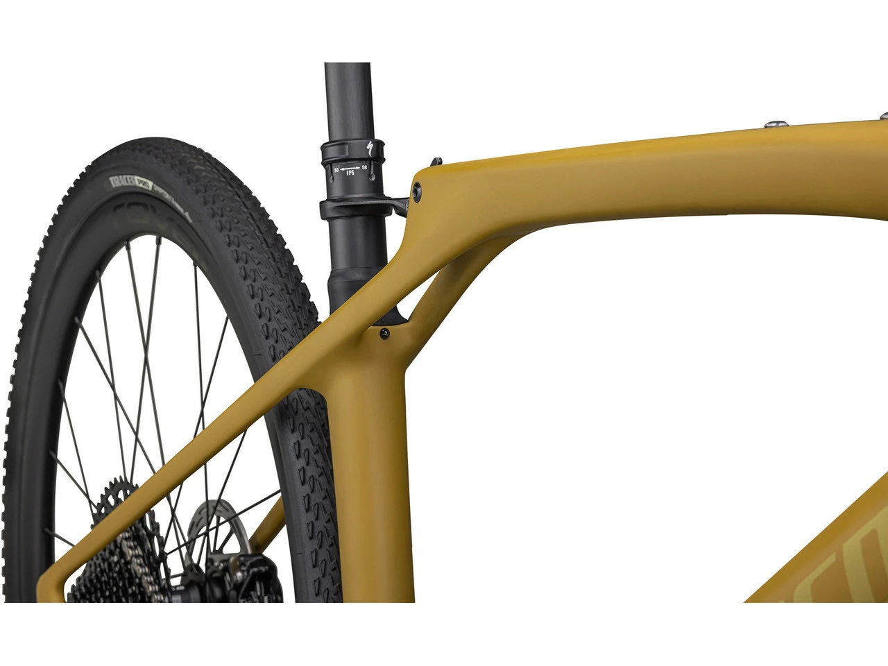 Spezifikationen:Einsatzbereich:GravelLaufradgröße:28″Größen:49 cm, 52 cm, 54 cm, 56 cm, 58 cm, 61 cmMaterial Rahmen:Carbon (11r)Material Gabel:CarbonKomponenten:Rahmen:Specialized Diverge STR, IC093-1, FACT™ 11r Carbon, SWAT-Technologie, Future Shock Fully System, Disc Flat Mount, 12 x 142 mmGabel:Specialized Diverge STR, FC073-1, Future Shock 2.0 mit Dämpfung, FACT Carbon, Disc Flat Mount, 55 mm Offset, 12 x 100 mmVorbau:Specialized Future CompLenker:Specialized Adventure Gear Hover, 103 mm Drop, 70 mm Reach, 12° FlareSteuersatz:Specialized S192500009Sattelstütze:S-Works FACT Carbon, 27,2 mm, 20 mm SetbackSattel:Specialized Body Geometry Power Expert, TitanstrebenKurbel:SRAM Rival 1 Wide, 40 Z Kettenblatt, mit SRAM DUB BSA 68 Wide InnenlagerPedale:ohneBremsen:SRAM Red eTAP AXS, hydraulische ScheibenbremseSchalt-/Bremshebel:SRAM Rival eTap AXSSchaltwerk:SRAM GX Eagle AXSKassette:SRAM NX Eagle PG-1230, 12-fach, 11-50 ZKette:SRAM GX Eagle, 12-fachLaufräder:Roval Terra CReifen:Specialized Tracer Pro, 2Bliss Ready, 700 x 42 mmFreigaben:Gewichtsbeschränkung:100 kg (Framepost 1/8), 125 kg (Framepost 2-7, 9) (Fahrer + Gepäck)Bremsscheibengröße max.:180 mm (VR), 160 mm (HR)Reifengröße max.:700 x 47C, 27,5 x 2,1″Features:STR = Suspend the RiderFuture-Shock-Rear-System für Komfort und Sicherheit auf ruppigen Wegenzur individuellen Anpassung zwei Frameposts mit je zwei Härtegraden im Lieferumfangfür Gravel optimierte GeometrieFuture-Shock-2.0-System für mehr KomfortSmooth-Boot-Design für sauberen Übergang vom Steuerrohr zum VorbauVertrauen und Fahrstabilität in unwegsamem Geländedynamische Lenkung dank eher kurzem Vorbaugrößtmögliche Reifenfreiheitleicht, Rahmen wiegt nur 1,05 kgmit 700C und 27,5″ (650B) Laufrädern fahrbarVielzahl an Montagepunkten für Flaschenhalter und TaschenSWAT-Öffnung im Unterrohrinterne KabelführungSupacaz Super Sticky Kush LenkerbandDiverge STR Sattelklemme aus 7075-T73 Aluminium, 33,3 mmSchläuche mit 48 mm SV-Ventilauch für Dropper Posts geeignetTechnologien:FACT™