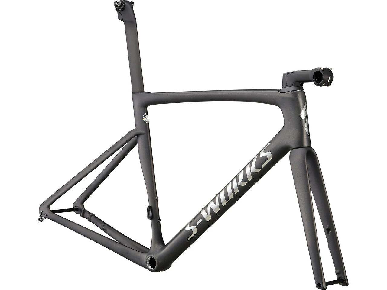 Das S-Works Tarmac SL7 Carbon-Rahmenkit von Specialized bildet die Basis für eine kompromisslose Rennmaschine: Es wurde auf allerbeste Aerodynamik und geringstmögliches Gewicht, auf Top-Handling, Fahrkomfort und Spitzengeschwindigkeit zugleich ausgelegt. Windkanaltests, hochmoderne Analyseverfahren und das Feedback von Profifahrern trugen dazu bei, es so windschnittig und schnell wie nur möglich zu machen. Dank seines High-Modulus-Materials ist es so leicht, dass jeder Aufbau sich nahe am UCI-Gewichtslimit bewegen wird. Gemäß der Rider-First-Engineered™-Philosophie hat Specialized außerdem bei jeder einzelnen Rahmengröße auf das optimale Carbon-Layup geachtet. Mit dem S-Works Tarmac SL7 Rahmenset als Grundlage Deines Traumbikes kannst Du allen davonfliegen, ob am Berg oder im Sprint.