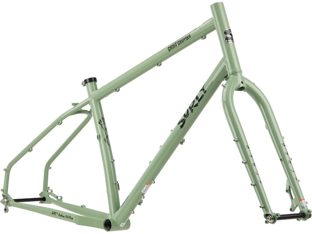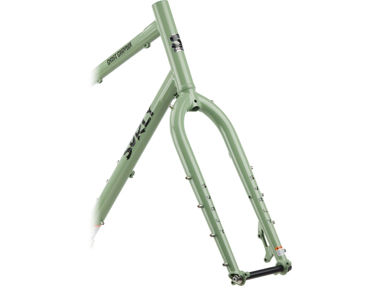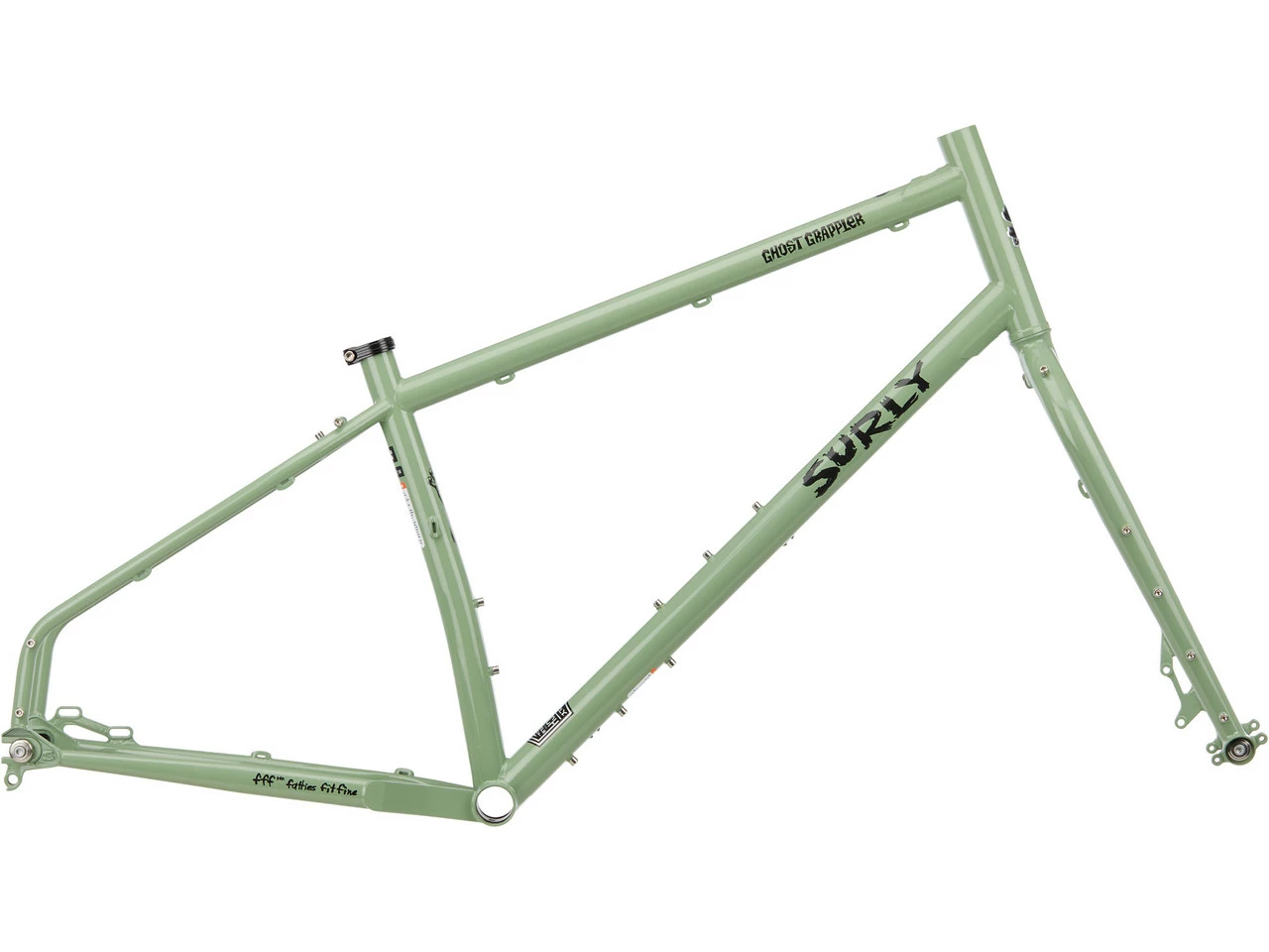 Das Ghost Grappler Rahmenkit von Surly ist die ideale Grundlage für ein 27,5″ Trail-Gravel-Bike. Die MTB-lastige Geometrie, die große Reifenfreiheit von 2,8″ und die Möglichkeit zur Dropper-Post-Montage lassen Dich auch Singletrails problemlos mit Dropbar fahren. Die zahlreichen Befestigungsösen für Trinkflaschenhalter, Gepäckträger und Taschen machen den robusten Stahlrahmen bereit für Bike-Packing-Touren.