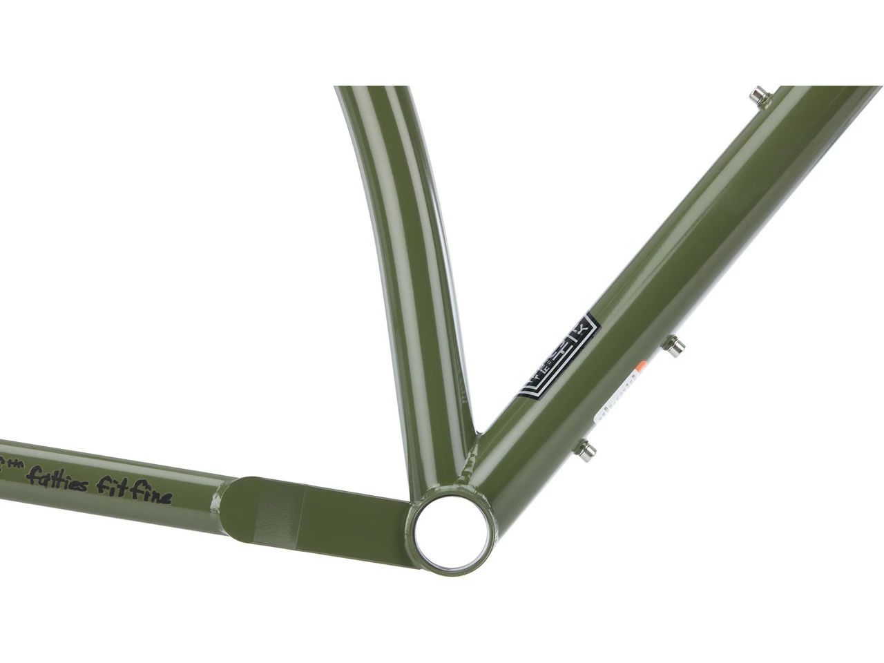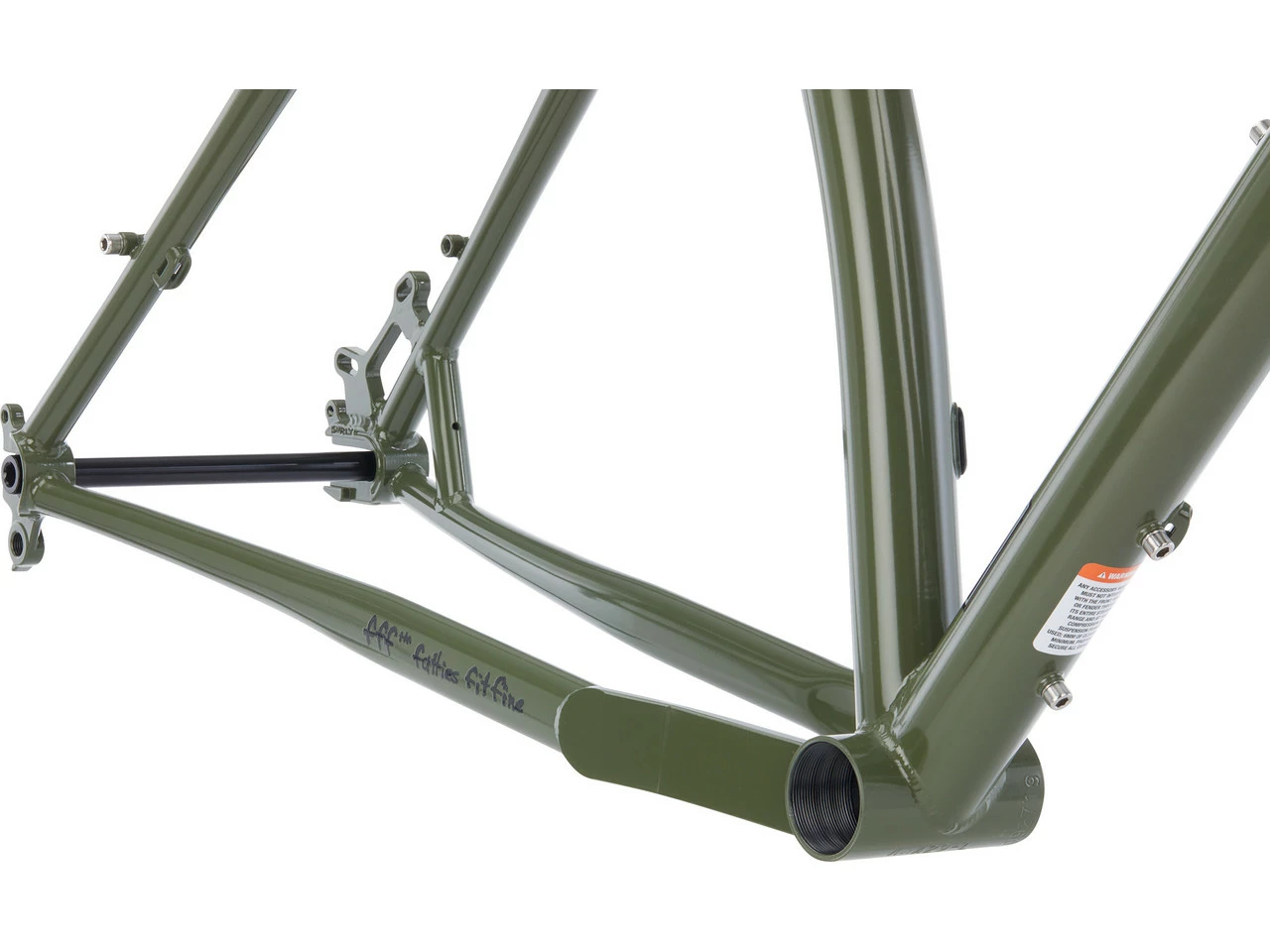 Das Surly Krampus Rahmenkit, das erste “ Plus-Bike“ seiner Art, ist mit der Zeit gegangen: Dank Gnot Boost Spacking kannst Du genau die Hinterradnabe fahren, die Dir passt, ob 10 x 135 mm, 12 x 142 mm oder 12 x 148 mm Boost. Mit seinem langen Steuerrohr und den kompakten Kettenstreben zwingt das Krampus jeden Trail in die Knie. Die konifizierten, teilweise tapered Rohre verleihen ihm Steifigkeit, ohne aufs Gewicht zu schlagen. Natürlich kannst Du eine verstellbare Sattelstütze und 3″ Reifen montieren – so hast Du noch mehr Spaß mit diesem wilden Pferd.
