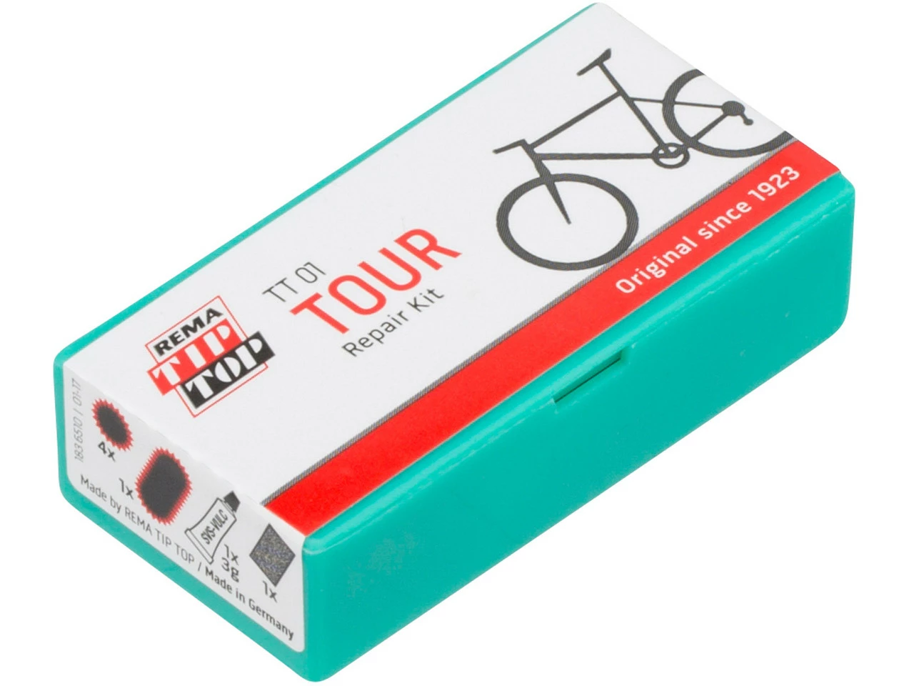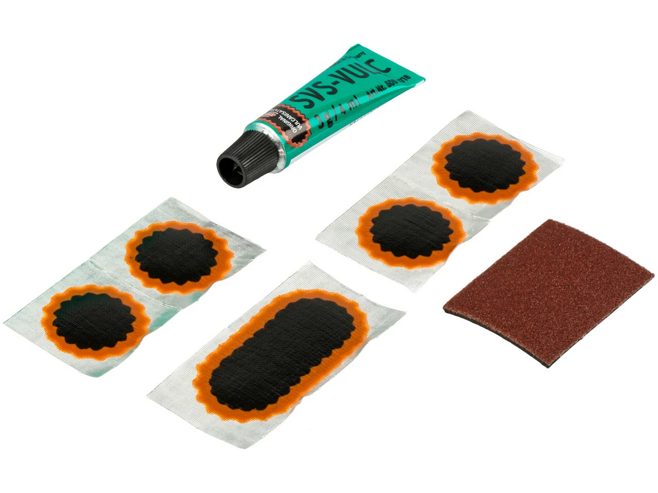 Lieferumfang:4 x Flicken Tip Top Größe F1 (ø 25 mm)1 x Flicken Tip Top Größe F2 (50 x 25 mm)1 x Tube Tube SVS-Lösung à 3 g1 x Schleifpapier