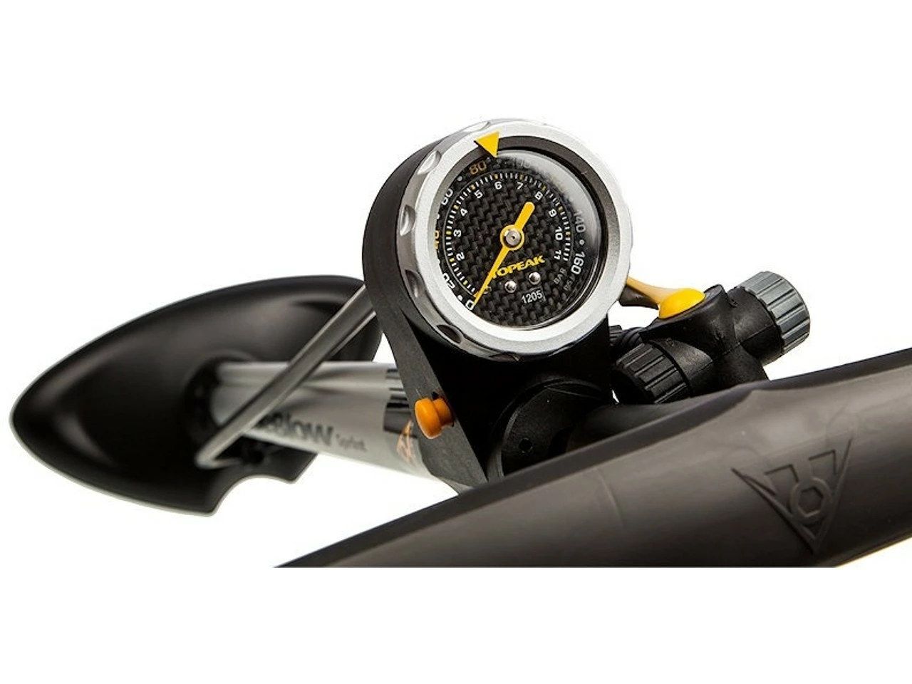 Alles astrein: langer Aluzylinder, obenliegende Druckanzeige und Transportsicherung am Griff. Das Auge pumpt mit, dank des Echtcarbon-Ziffernblattes.