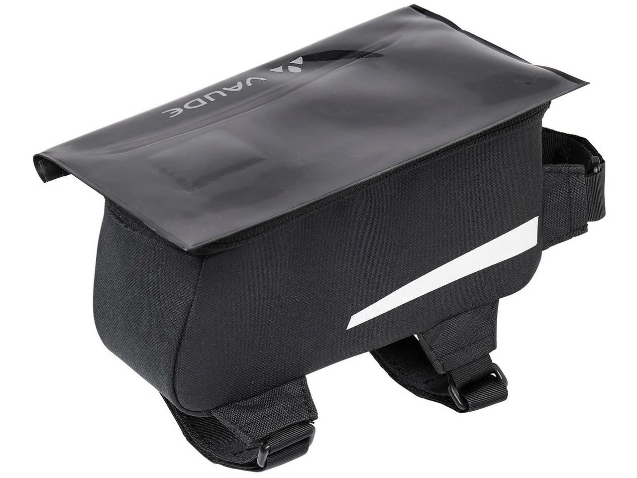 Die Carbo Guide Bag II Oberrohrtasche von VAUDE kommt mit einer Smartphone-Hülle durch die Du Dein Smartphone während der Fahrt bedienen kannst.